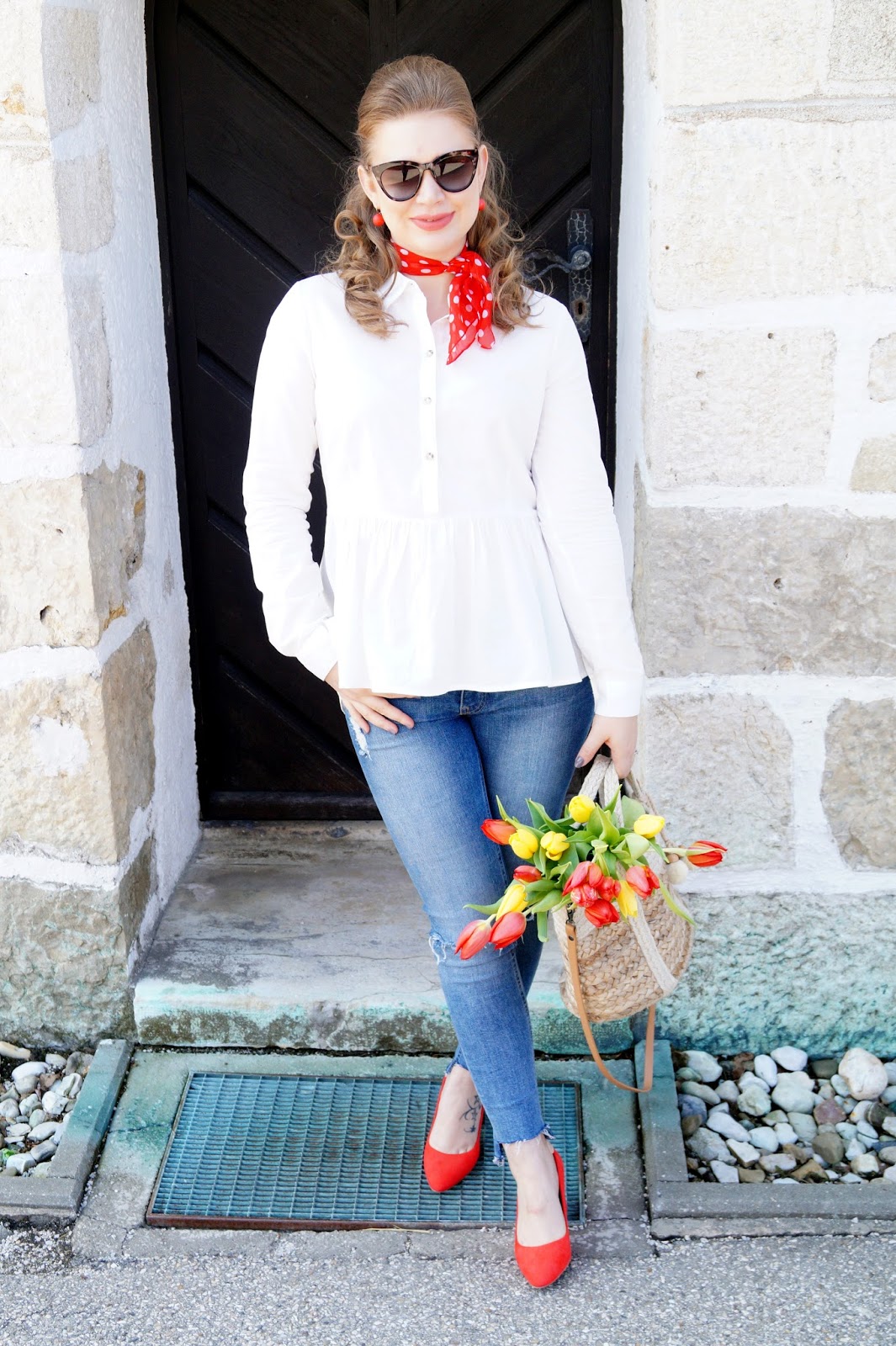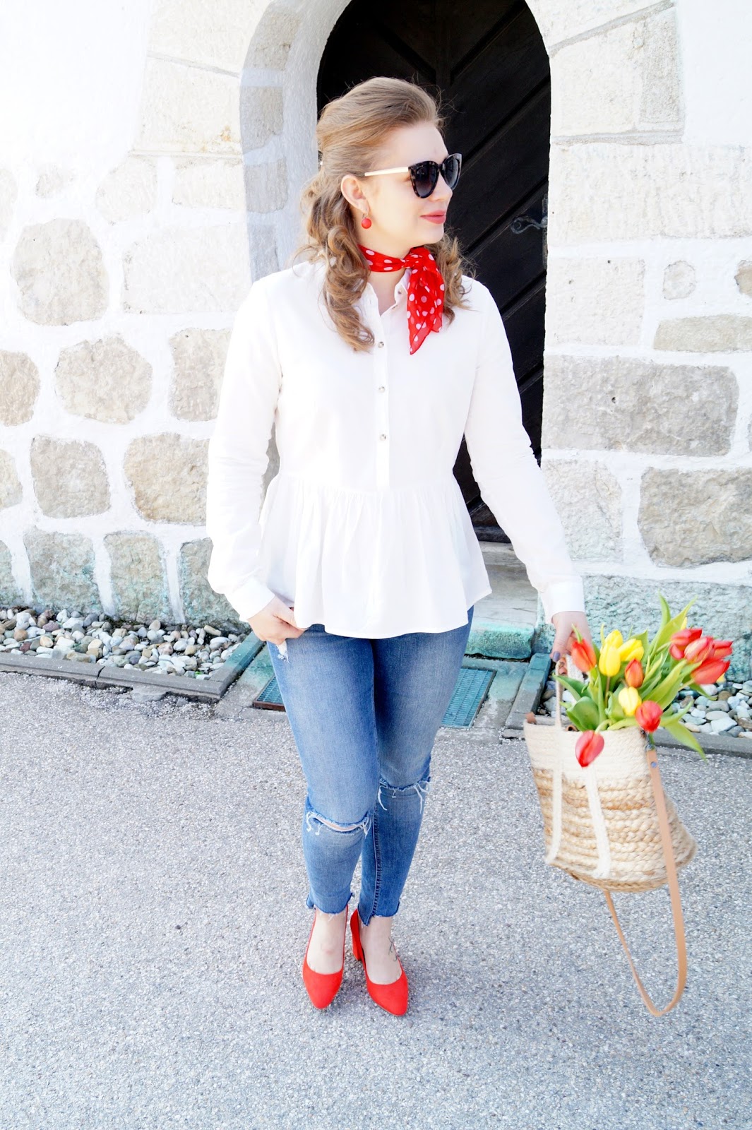 I combined it with a pair of high-waisted denim. To add some color to the look I put on my neckerchief I got from Bijou Brigitte (polka dots are still going strong over here) and a pair of block heels in the same color. This really was the cutest and most springish combintion I have worn in a while. To round up the whole look I took this woven raffia bag I got from Mango last year with me. The flowers where added as a statement to make the whole look even more springier.